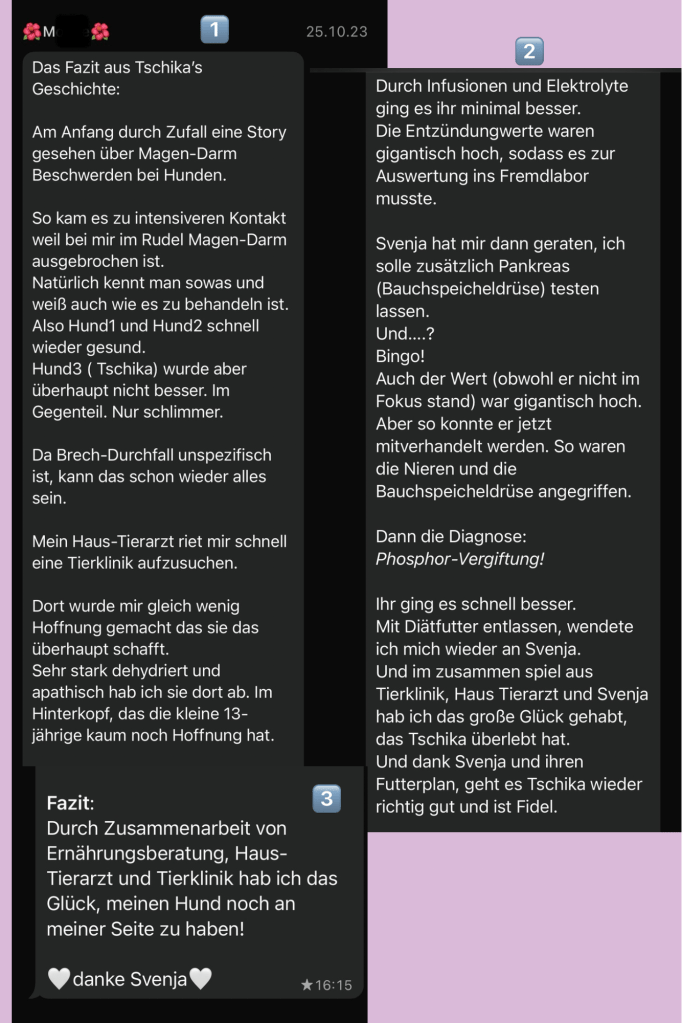 Ich bin seit 2017 BARF Beraterin und weitere Ausbildungen in diesem Bereich folgten. Damals war der Ansatz „Ich mache das für meine Hunde“, doch schon schnell wurde mir klar, dass es dabei nicht bleiben wird. Obwohl meine Hunde keine offensichtlichen Probleme hatten und ich dachte „Mein Hund hat einen sensiblen Magen, der kann nicht alles fressen“ ist so ein „Ich erziehe meinen Hund antiautoritär Problem“ und die Besitzer lassen sich auf das Spiel ihres Pseudo Mäckelhundes ein. Bis ich selbst einen Magen-Sensiblen Hund hatte.